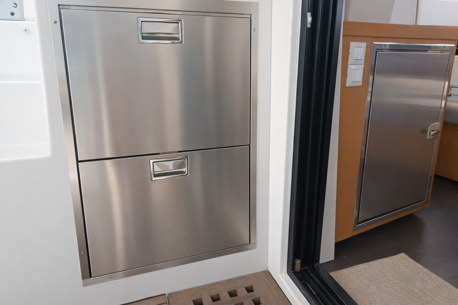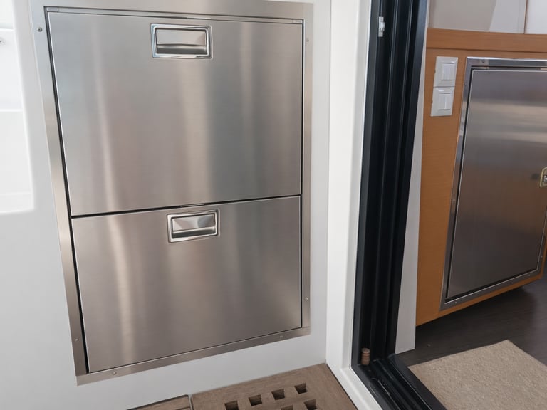 We have three fridges on board: the factory top loader, the factory front loader, and an extra double-drawer fridge/freezer in the cockpit.