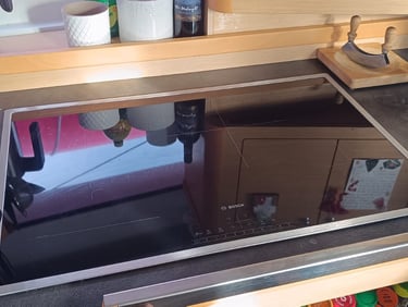 A home style full size induction cooktop from BOSCH integrates perfectly into the galley. The Oven is a multifunction electric oven from Panasonic, which bakes you perfect bread every day.