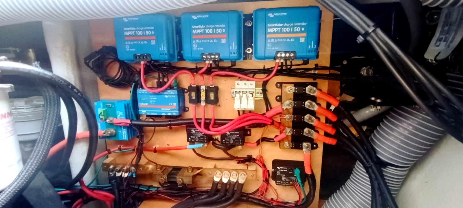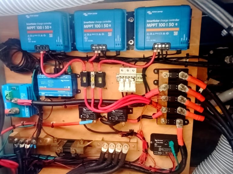 6 x 380W solar panels in 3 groups on 3 Victron Smart charge controllers. Monted on an elegant and robust stainelss steel construction. The roof mounted panels are lifted for proper ventilation.